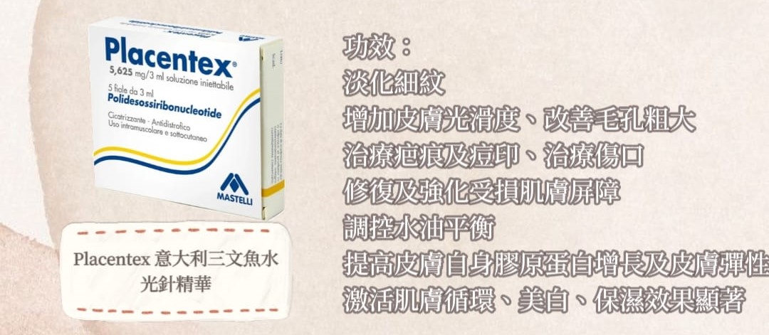 義大利Mastelli旗下的Placentex三文魚PDRN,PDNA屬水解再生元素,Placentex是從富含與人類的鹼基組成一致的三文魚DNA成分中,提取幫助皮膚組織再生的PDRN物質,為受損傷的皮膚,增強膠原蛋白和非膠原蛋白性蛋白質的分泌功能,促進傷口的均勻愈合,改善疤痕以及改善膚色,同時在毛孔收縮方面也有出色的效果。