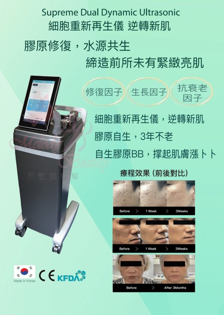 單次價– 水源共生膠原細胞療程 – $1588 由 · 已發表 2023-07-31 · 已更新 2024-05-13 水源共生膠原細胞療程 採用DDU 雙頻修護嶄新雙頻超聲波修護 (聲波炮) 技術源自德國,療程集合三種高頻高能量超聲波 (10MHz、3MHz及1MHz), 更是唯一能同時輸出其中兩種不同頻率的超聲波儀器。兩種頻率同時深入至肌膚細胞,傳遞能量,迅速修護及強化肌膚,使肌膚恢復應有彈性及維持水潤、嫩白狀態。 針對問題 .皮膚及細胞損傷 .療程後肌膚弱敏 .膠原流失、彈性欠佳 .乾燥缺水 功效 .促進新陳代謝,加速細胞修復 .重塑膠原結構,回復水潤緊緻 .強化療程效果,消除療程後水腫 .對抗炎症泛紅,改善暗瘡及玫瑰痤瘡 療程原理 此效應能於細胞內形成水震動,產生「空穴效應」(cavitation effect) ,有助重塑骨膠原組織結構、促進膠原母細胞生成更多膠原蛋白,並增加熱激蛋白 (HSPs) 及肌膚自身保濕因子 (GAGs) 例如透明質酸 (HA),高效修護療程後或損傷皮膚,使肌膚時刻保持健康水潤。同時亦可降低破壞性蛋白質 (MMPs),減少膠原蛋白的流失,並維持皮膚細胞健康。 療程特點 .德國技術 .現時唯一雙功率超聲波輸出醫美療程 .無針、無痛、無創、無副作用