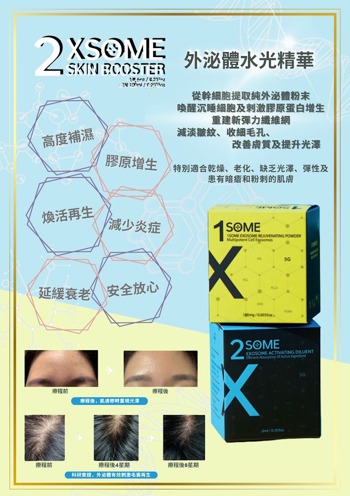 2xsome外泌體水光精華液利用冷凍技術將幹細胞培養液中的外泌體分離和純化,以保持其消炎作用,更結合多種營養物質幫助皮膚更容易吸收外泌體;2xsome有效修復受損細胞及刺激膠原蛋白增生,重建新彈力纖維網,達到減淡皺紋、收細毛孔、改善膚質及提升光澤的效果,尤其適合乾燥、老化、缺乏光澤、彈性及患有暗瘡和粉刺的肌膚。