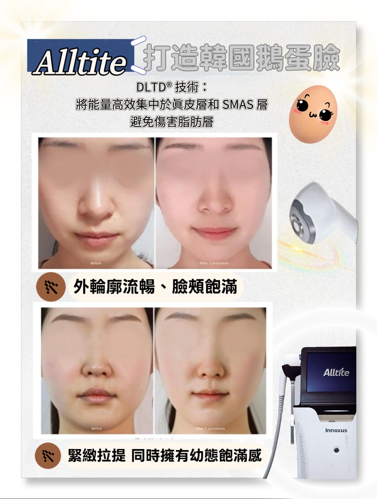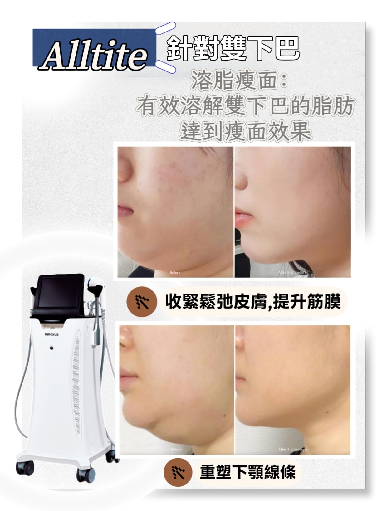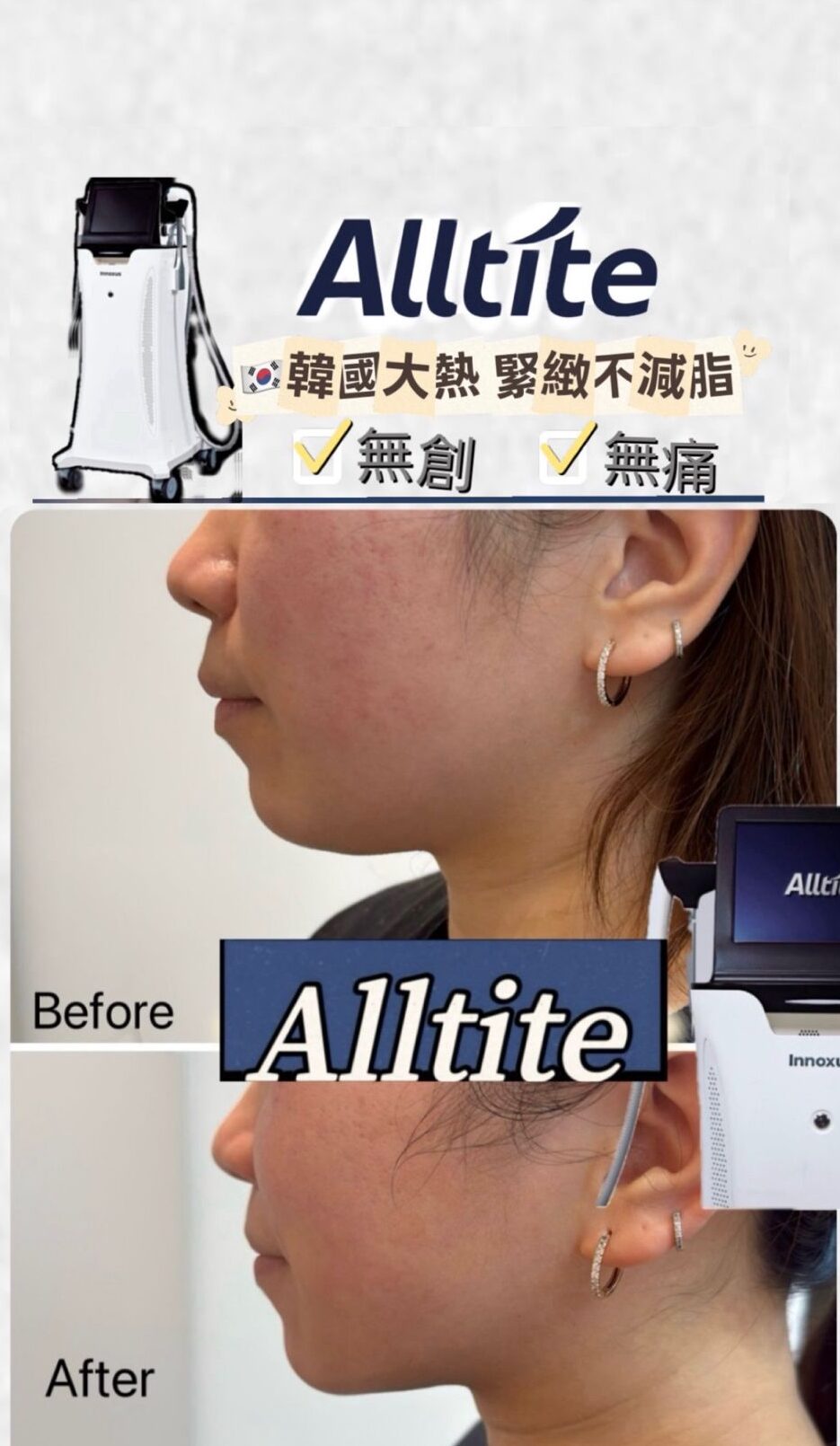 • 不凹陷、更飽滿: 與傳統技術不同,Alltite 能避開脂肪層,避免因溶脂導致的面部凹陷,適配瘦臉人群。